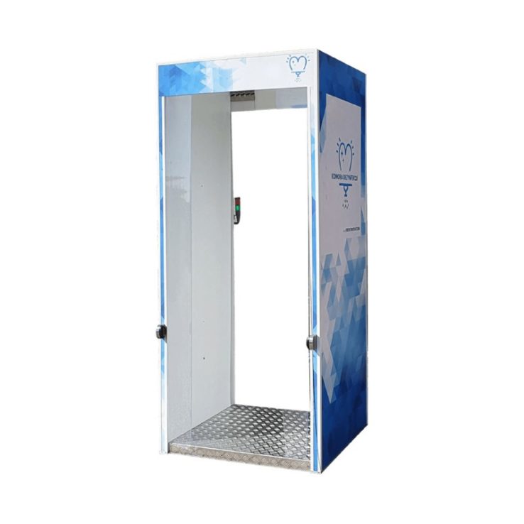 The Walk through enclosure is portable system equipment with sanitizer and soap dispenser. The disinfection chamber is able to sterilize the human body from germs and bacteria & viruses. Senses human body and gives output to the circuit and circuit gets activated and whole system activates and all 8 sprayers gets activated Machine can sanitize 4-5 humans in a minute and 250-300 humans in an hour
